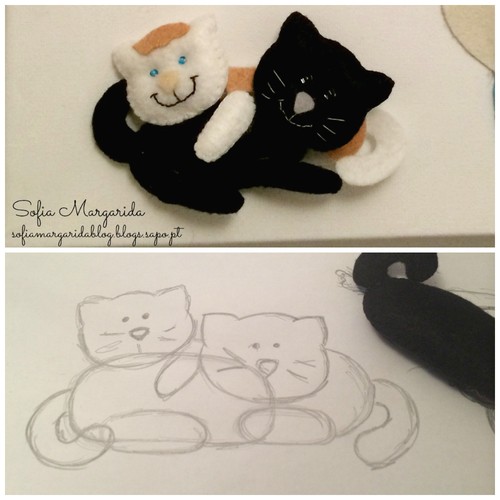 Olha bem o jeitinho que ela tem para desenhar - nenhum! Mas é assim que as fofurinhas vão ganhando vida. Ali ao cantinho já se encontra meio gatinho a ser preparado. Estes dois gatinhos fazem parte de um trabalho que está a levar-me à loucura! Nunca tinha feito nada igual e está a ser tão desafiante... Prometo que depois de entregue à pessoa a que se destina eu mostro o resultado final!